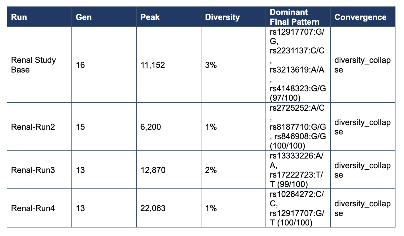 Under the original search settings, renal runs converged by generations 13–16 with terminal diversity of 1–3%. Final states were near-monocultures, with 97–100 of 100 candidates occupying a single dominant pattern. However, the dominant attractor differed across runs, indicating rapid fixation without cross-run structural recurrence.