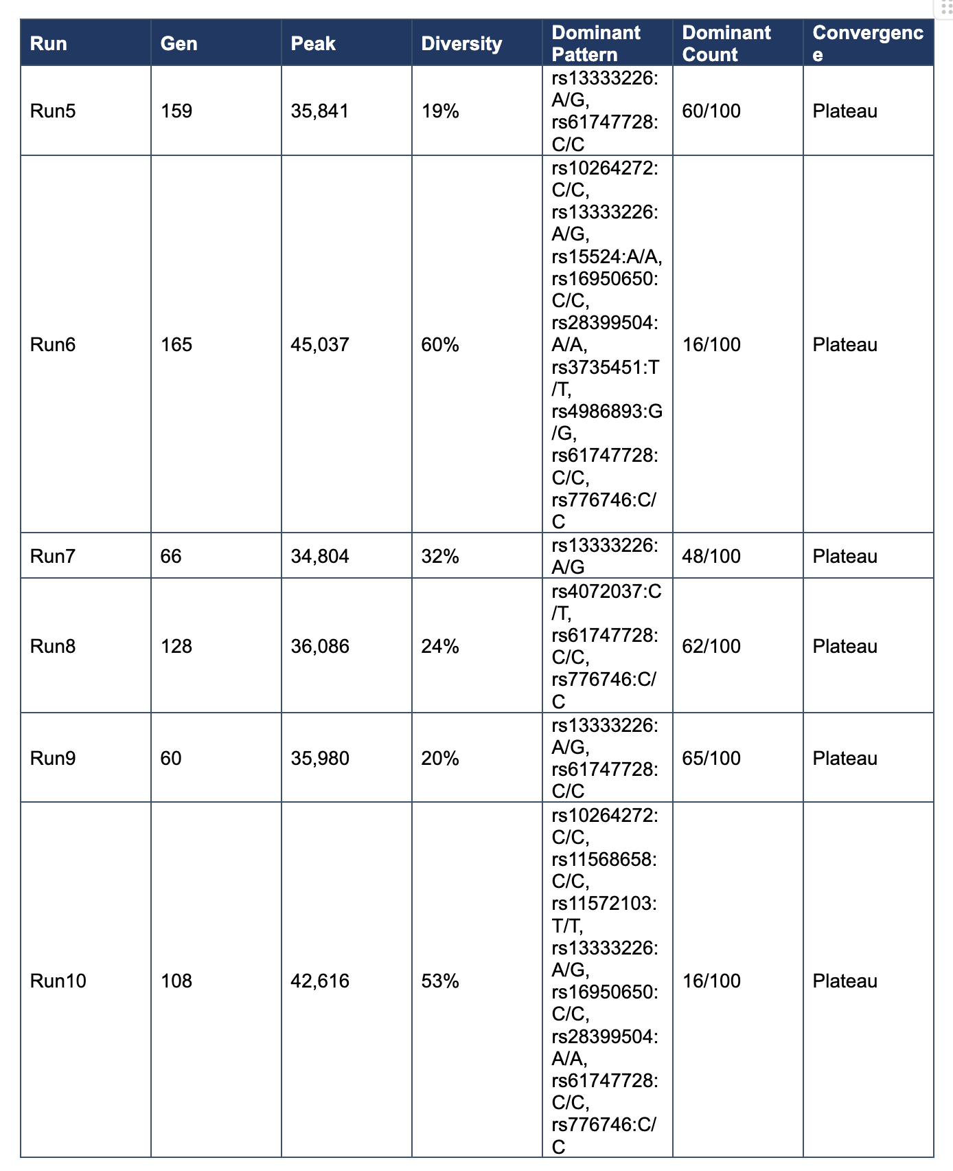 Across Runs 5–10, convergence occurred between generations 60 and 165, diversity was preserved at 19–60%, and peak fitness increased to a range of 34,804–45,037. Exact terminal patterns remained variable, but recurrent contributors emerged repeatedly across runs.