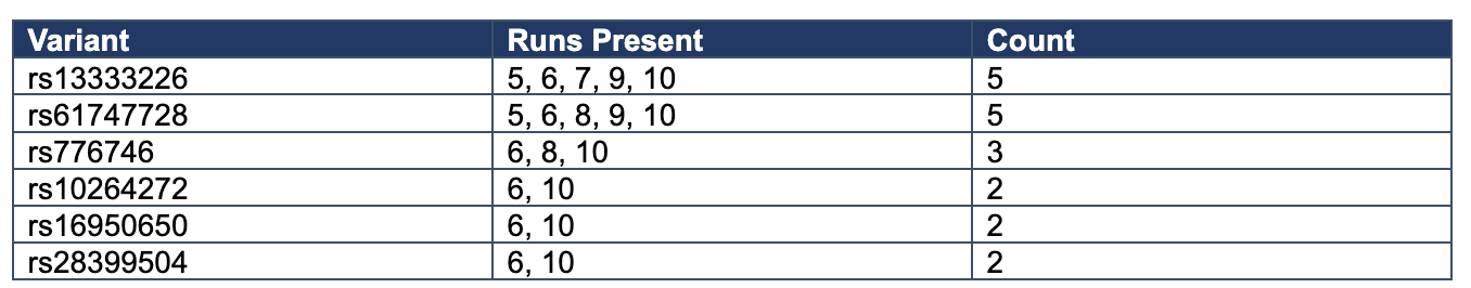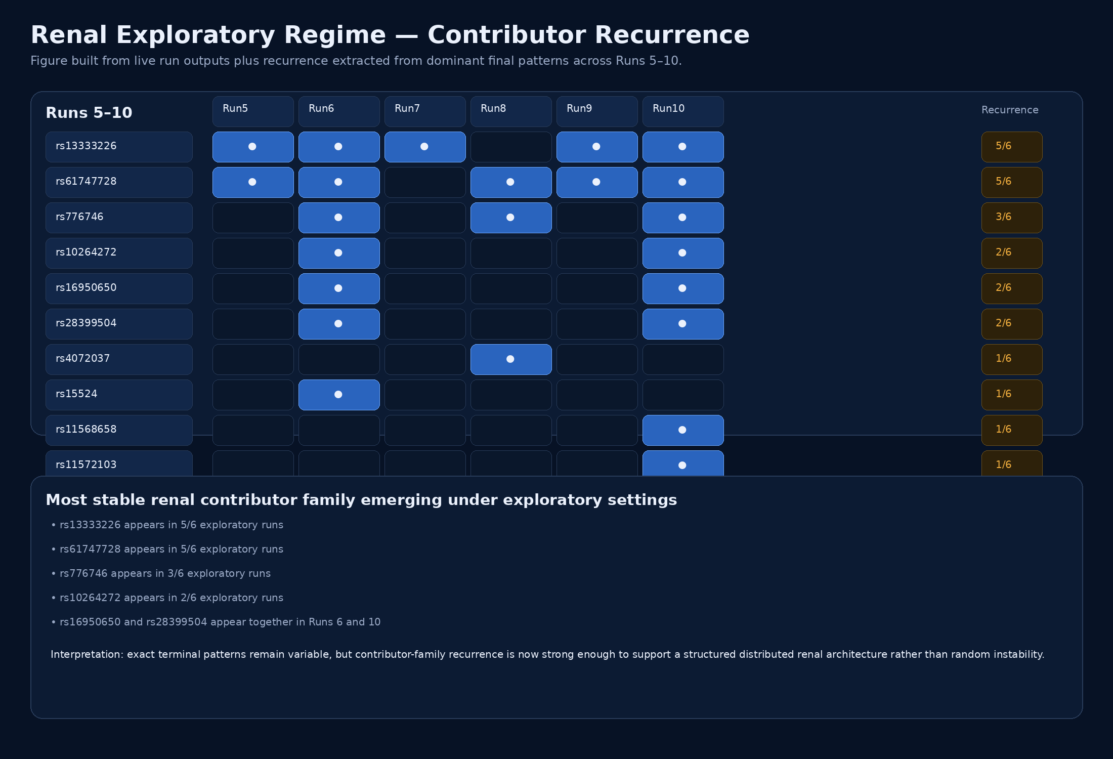Across Runs 5–10, exact dominant configurations remain variable, but recurrent contributors emerge repeatedly, especially rs13333226 and rs61747728, with secondary recurrence of rs776746, rs10264272, rs16950650, and rs28399504. This pattern supports family-level recurrence and biological coherence without exact-pattern recurrence, consistent with a structured distributed architecture rather than a reducible single-attractor system.