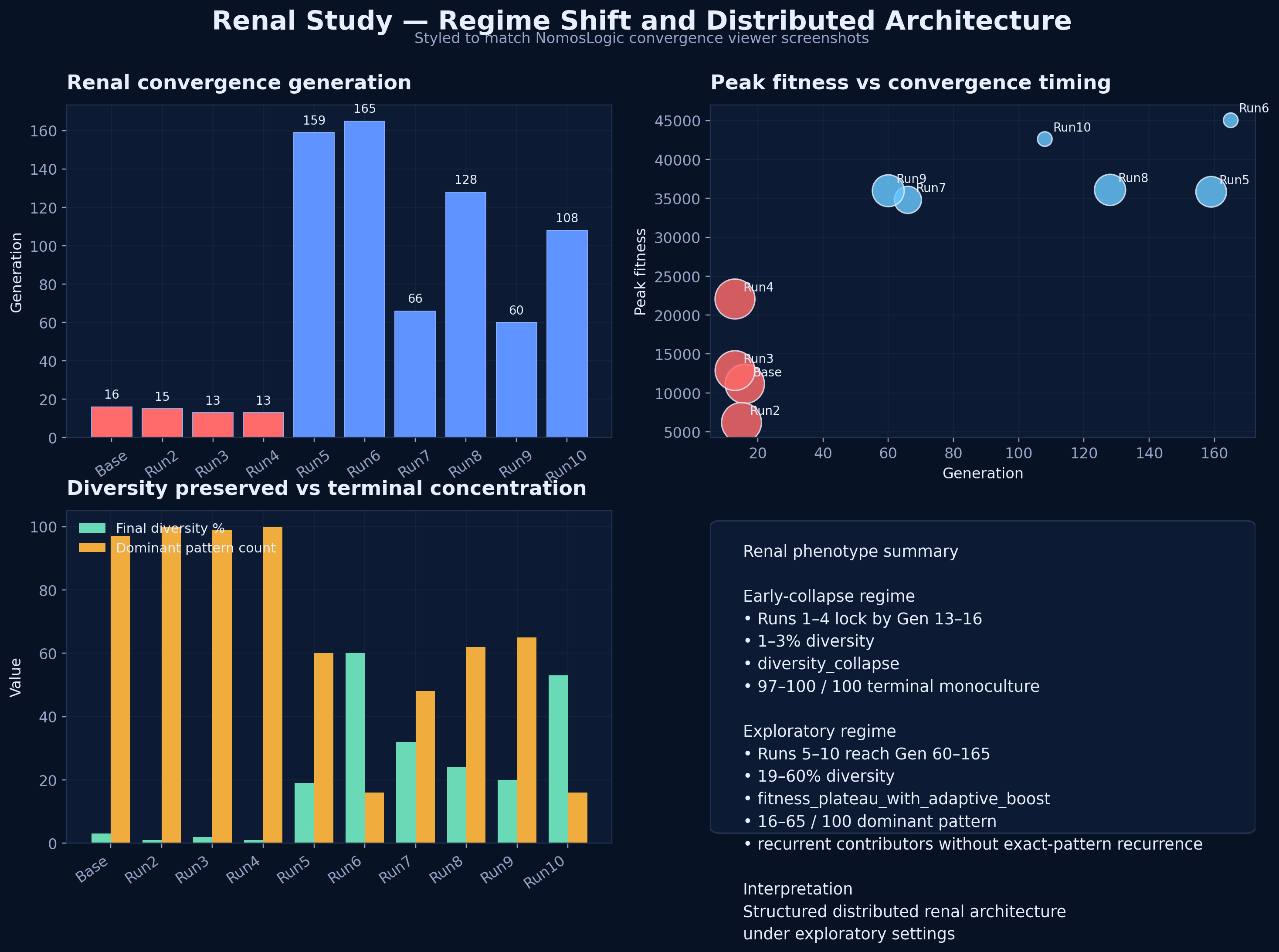 Renal behaves as a structured distributed phenotype under exploratory search conditions. Earlier interpretations based on rapid monoculture collapse were likely distorted by premature fixation. When exploration is preserved, renal consistently reaches higher-fitness plateau states with sustained diversity and recurring contributors, supporting a distributed but biologically coherent system architecture.