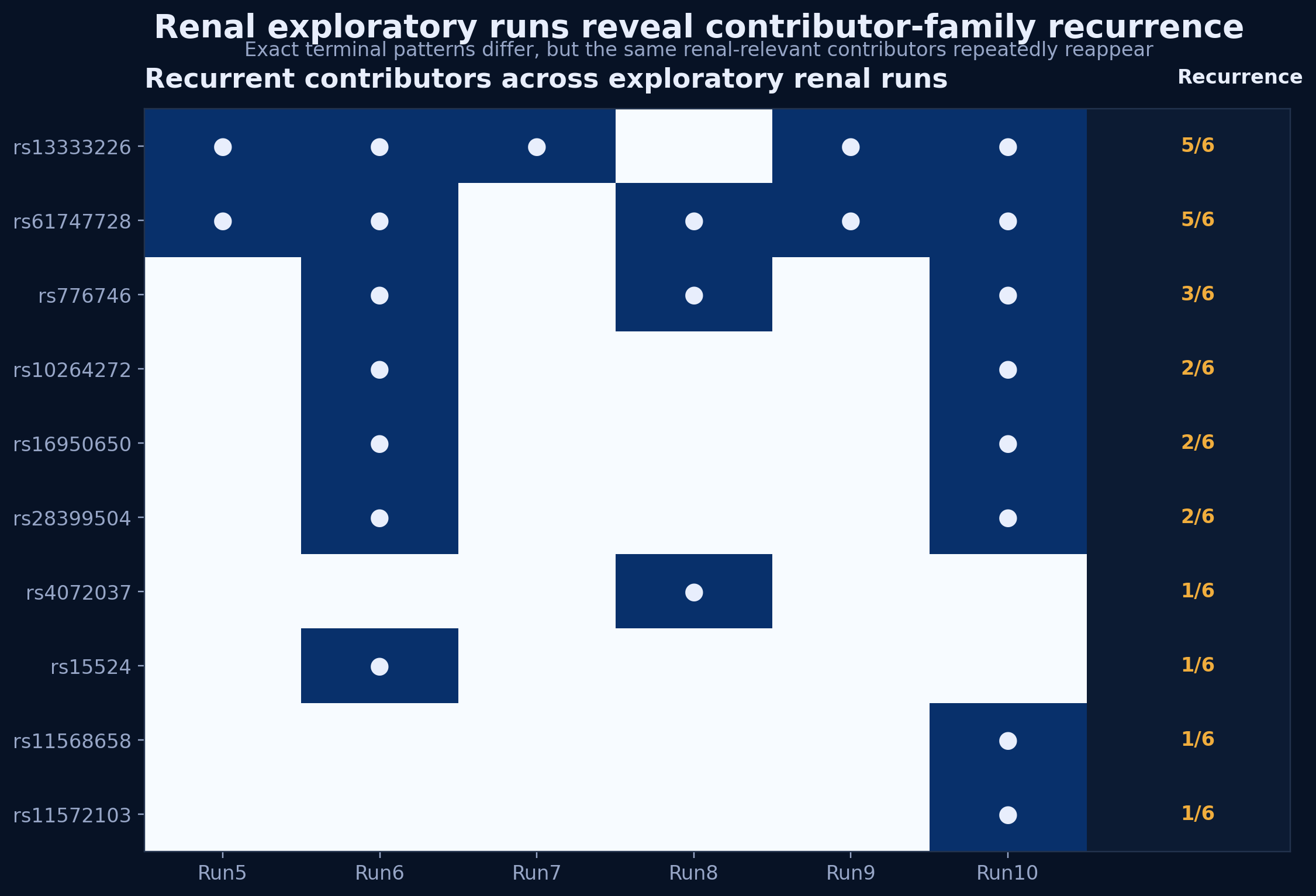 Figure 3. Exploratory renal runs do not recur to one exact terminal pattern, but repeatedly recover a shared contributor family.