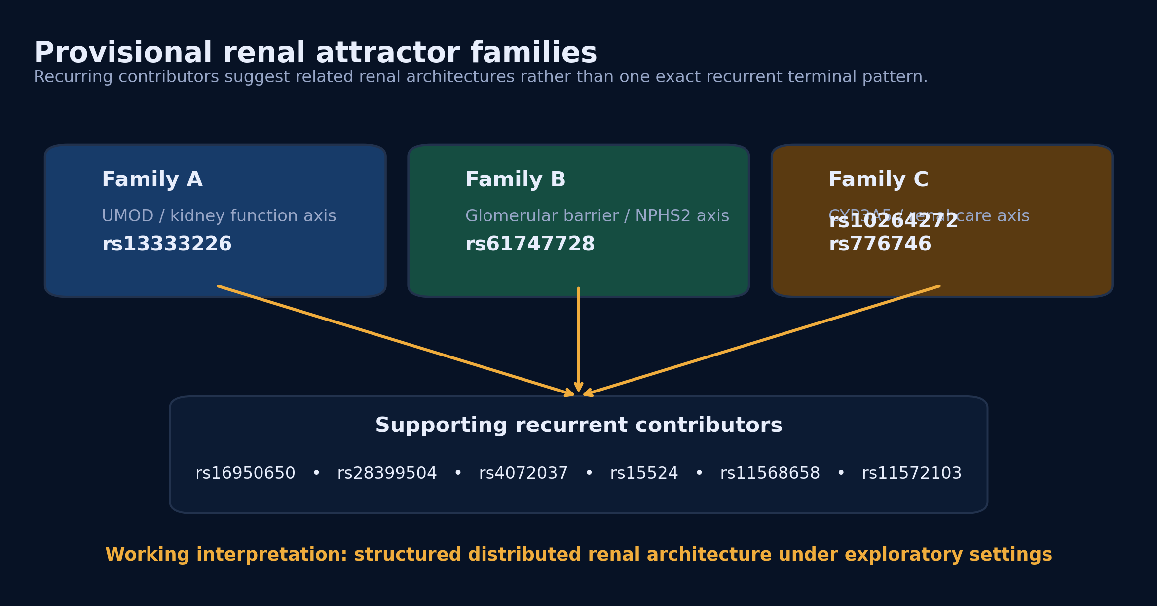 Recurrence analysis suggests at least three renal-relevant contributor axes centered on UMOD-associated, glomerular barrier-associated, and CYP3A5-associated biology. Different runs assemble distinct high-fitness combinations from this shared contributor neighborhood, indicating a distributed but biologically coherent renal architecture. This is consistent with the PROTEUS distinction between reducible systems, which recur to one dominant configuration, and distributed systems, which preserve stable behavior across multiple related high-fitness configurations.
