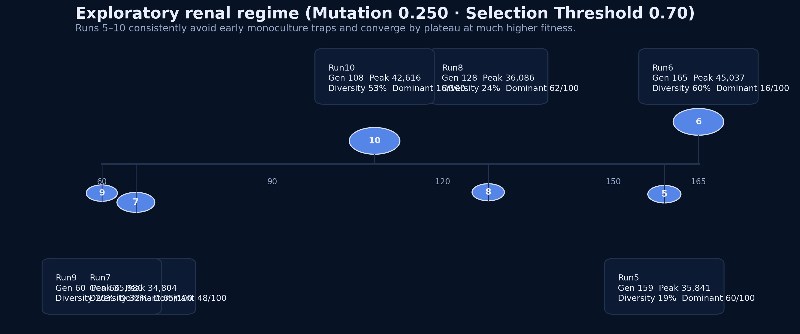 The original renal settings produced early low-fitness monoculture collapse, whereas the exploratory settings yielded later plateau behavior, much higher peak fitness, and sustained structural diversity. This shift argues against interpreting the early renal runs as the definitive phenotype and instead supports a parameter-sensitive distributed architecture under more adequate exploration.