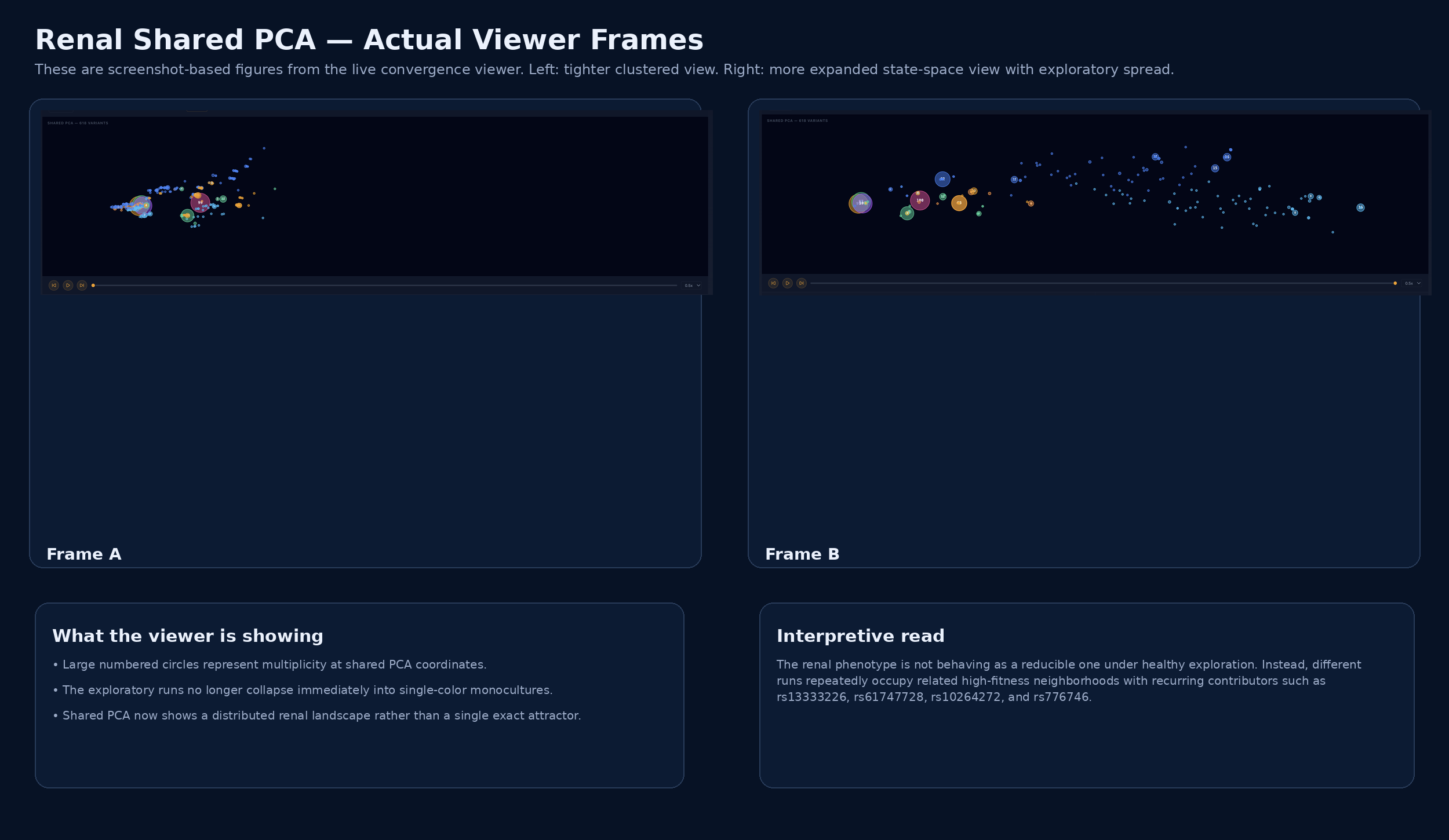Cross-run overlay of renal exploratory runs. Shared embedding of independent renal simulations under exploratory settings shows that exact terminal configurations differ across runs, but candidate populations repeatedly occupy related high-fitness regions associated with recurrent contributors including rs13333226, rs61747728, and rs776746. This pattern supports family-level recurrence without exact-pattern recurrence, consistent with the distributed configuration class described in PROTEUS.