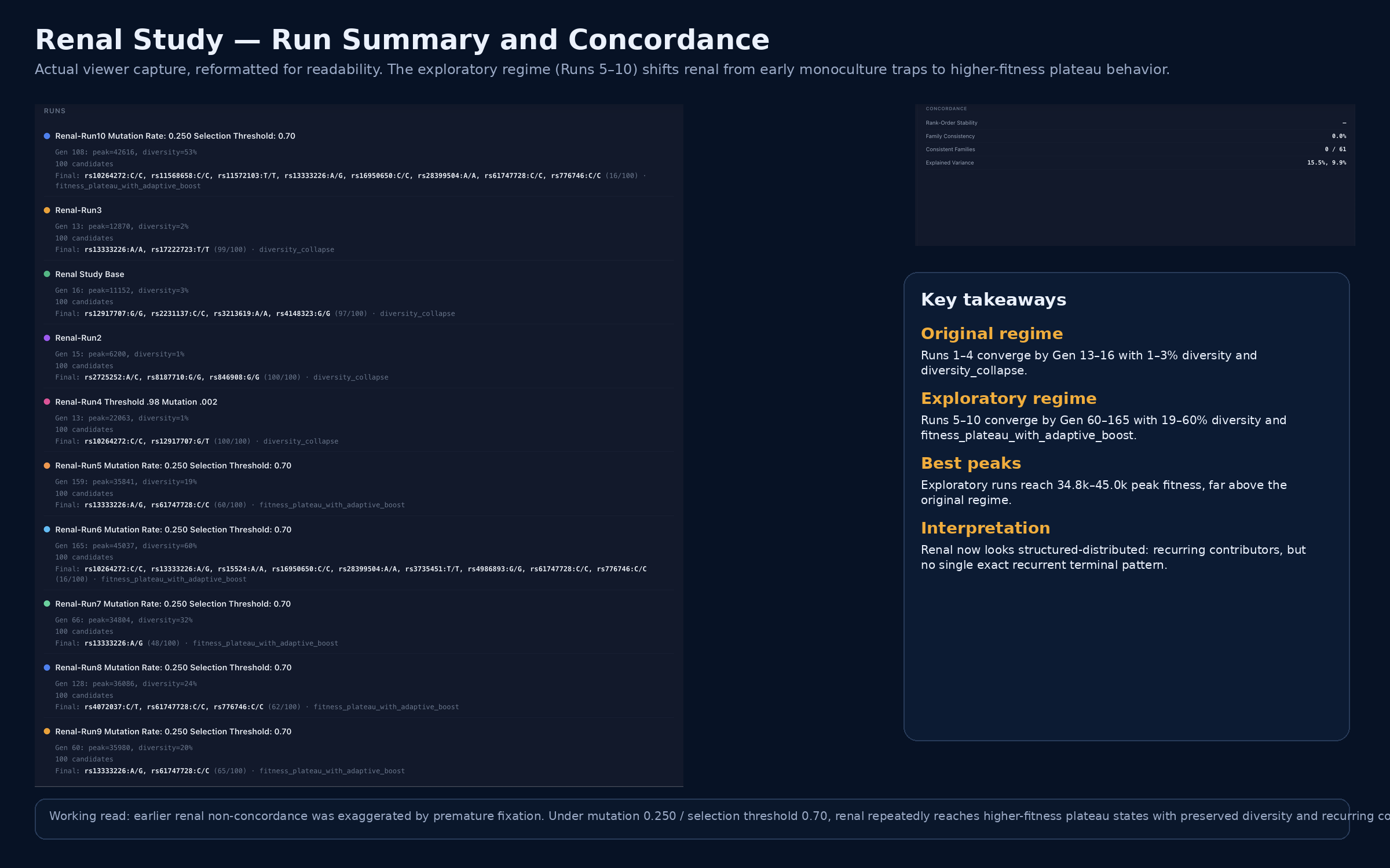 These findings indicate that renal is not reducible to a single dominant recurrent configuration under the tested conditions. At the same time, the exploratory runs do not behave randomly. Instead, they repeatedly recover related high-fitness configurations with overlapping contributors, indicating a structured distributed architecture. The sharp contrast between the original and exploratory regimes further suggests that the earlier low-diversity renal outcomes were at least partly artifacts of premature fixation. Under healthier exploration, renal reveals coherent contributor families rather than exact-pattern recurrence.