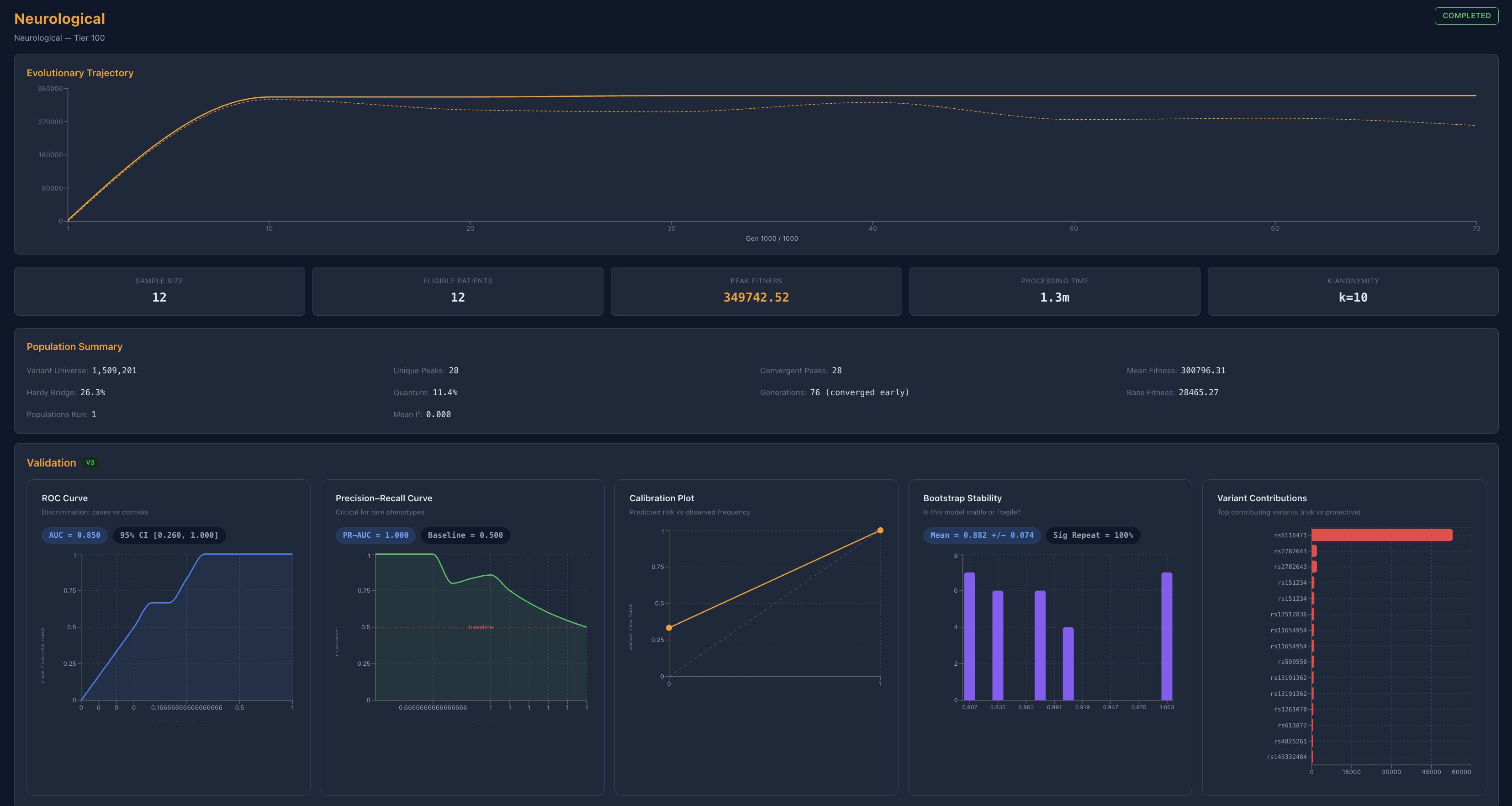 That is the premise behind Proteus V3, an evolutionary optimization framework designed to identify multi-variant interaction structures under validation pressure. Candidate configurations are evaluated not only for fitness, but also for reproducibility across cross-validation, permutation-based null modeling, and bootstrap resampling. Biological plausibility can be incorporated through pathway and network constraints, allowing the system to prioritize structured signal over merely frequent co-occurrence.