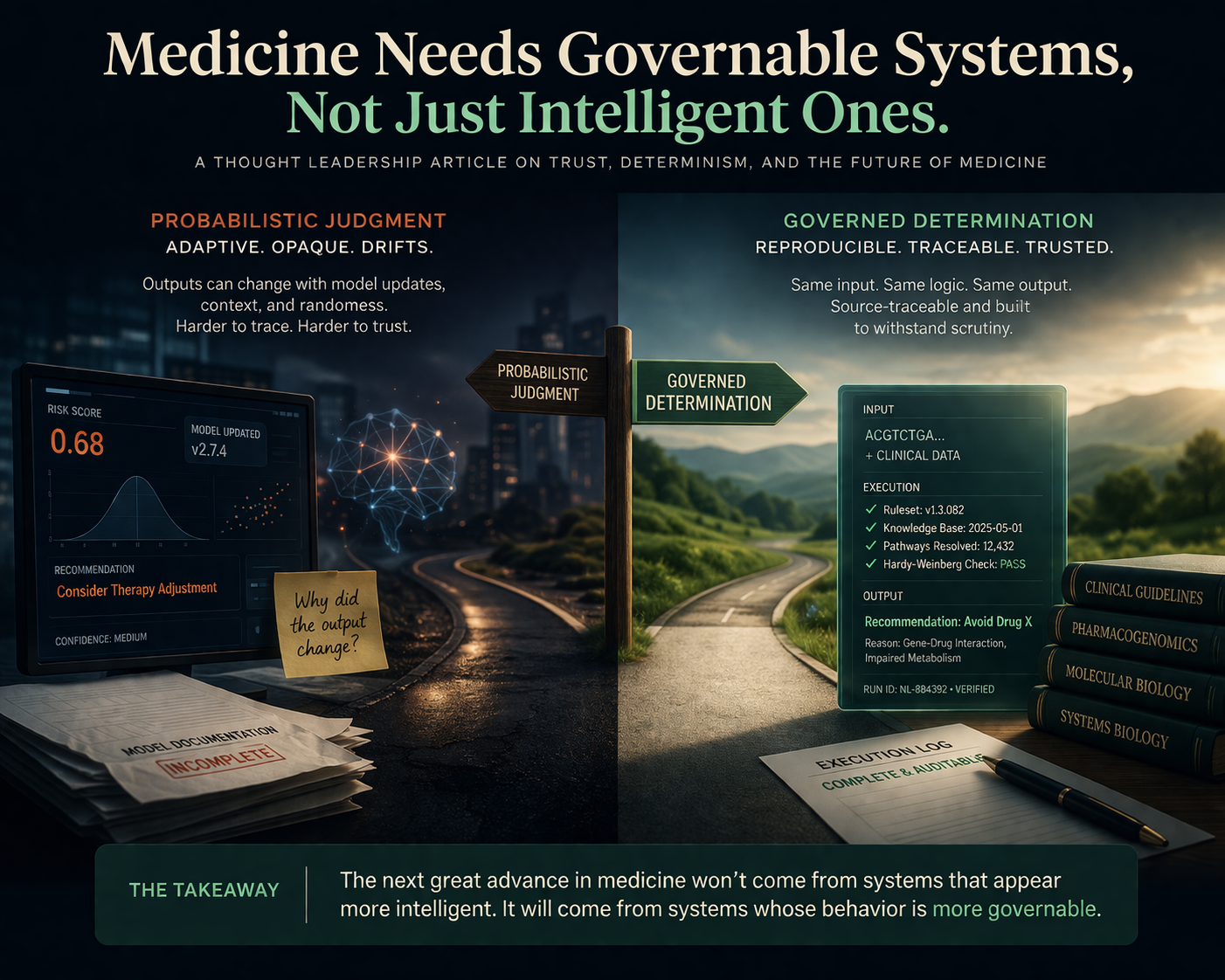 At the point where a system contributes to medication guidance, molecular interpretation, or disease understanding, ambiguity is no longer a neutral property. It becomes a governance problem. If the same input can produce materially different outputs over time, then trust is no longer anchored in evidence alone. It is anchored in a shifting relationship between model state, unseen updates, contextual variation, and post hoc explanation.