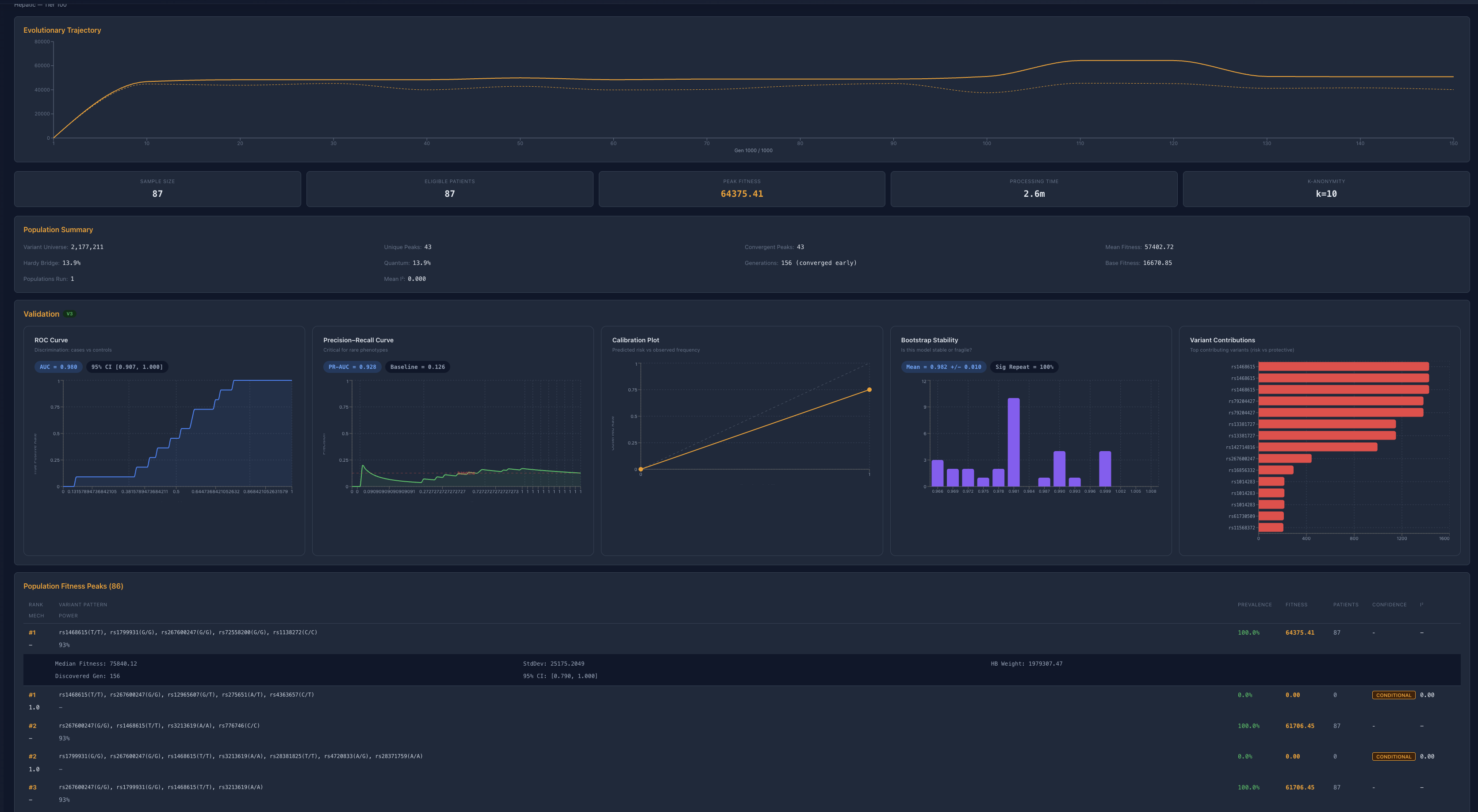 We applied an evolutionary optimization framework (Proteus V3) across multiple biological domains—cardiovascular, oncological, metabolic, and neurological—to identify stable, multi-variant genetic interaction structures. Across all domains, the system consistently converged on low-dimensional, interpretable hierarchies composed of dominant variants (“anchors”), secondary modifiers, and non-contributing conditional variants.