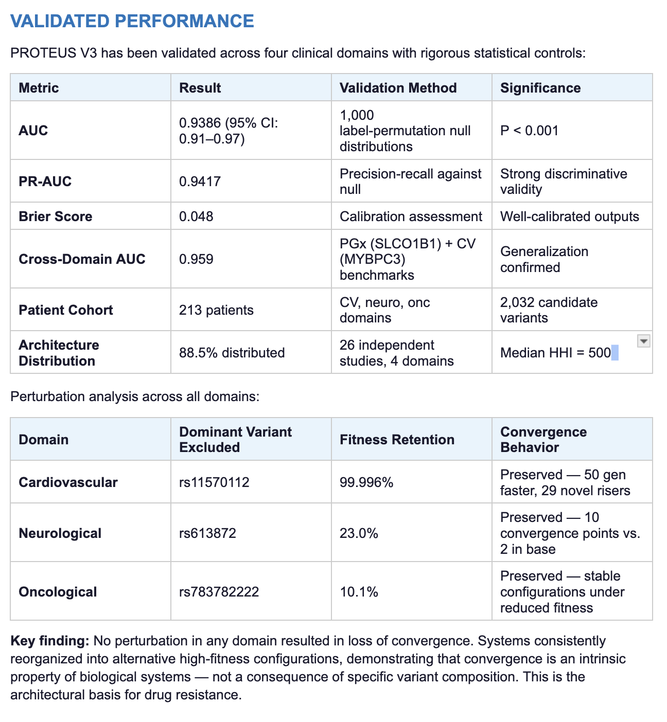 Focused analyses of specific drug targets, resistance mechanisms, or patient stratification challenges. PROTEUS V3 processes your genomic data and delivers deterministic convergence analysis, constraint architecture classification, and perturbation modeling.