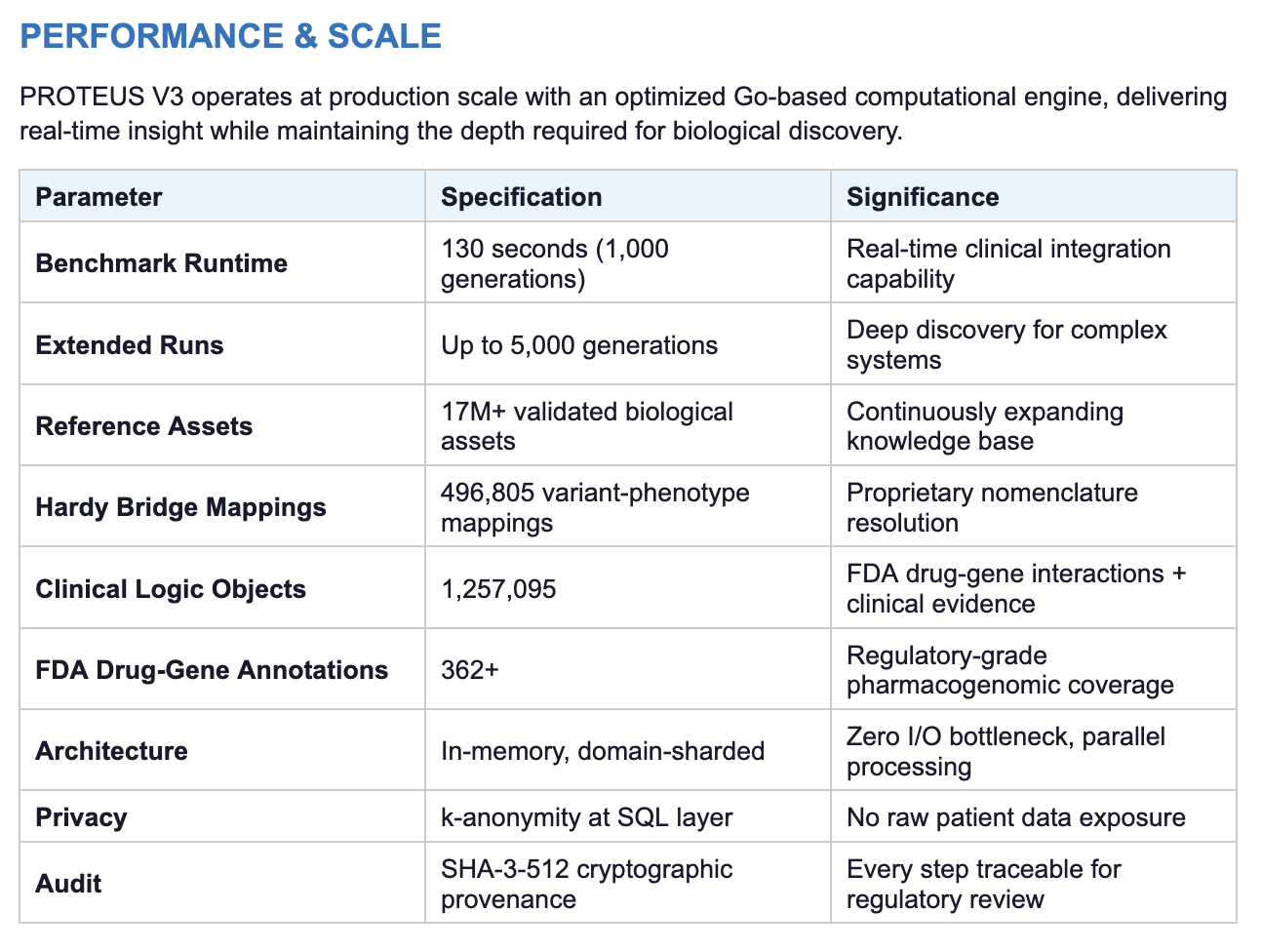 Unlike probabilistic AI/ML systems, PROTEUS V3 does not infer associations from data. It executes deterministic simulation against 17M+ validated biological and pharmacogenomic assets, producing outputs that are reproducible, traceable, and grounded in underlying biological constraint. Same inputs. Same outputs. Every time.