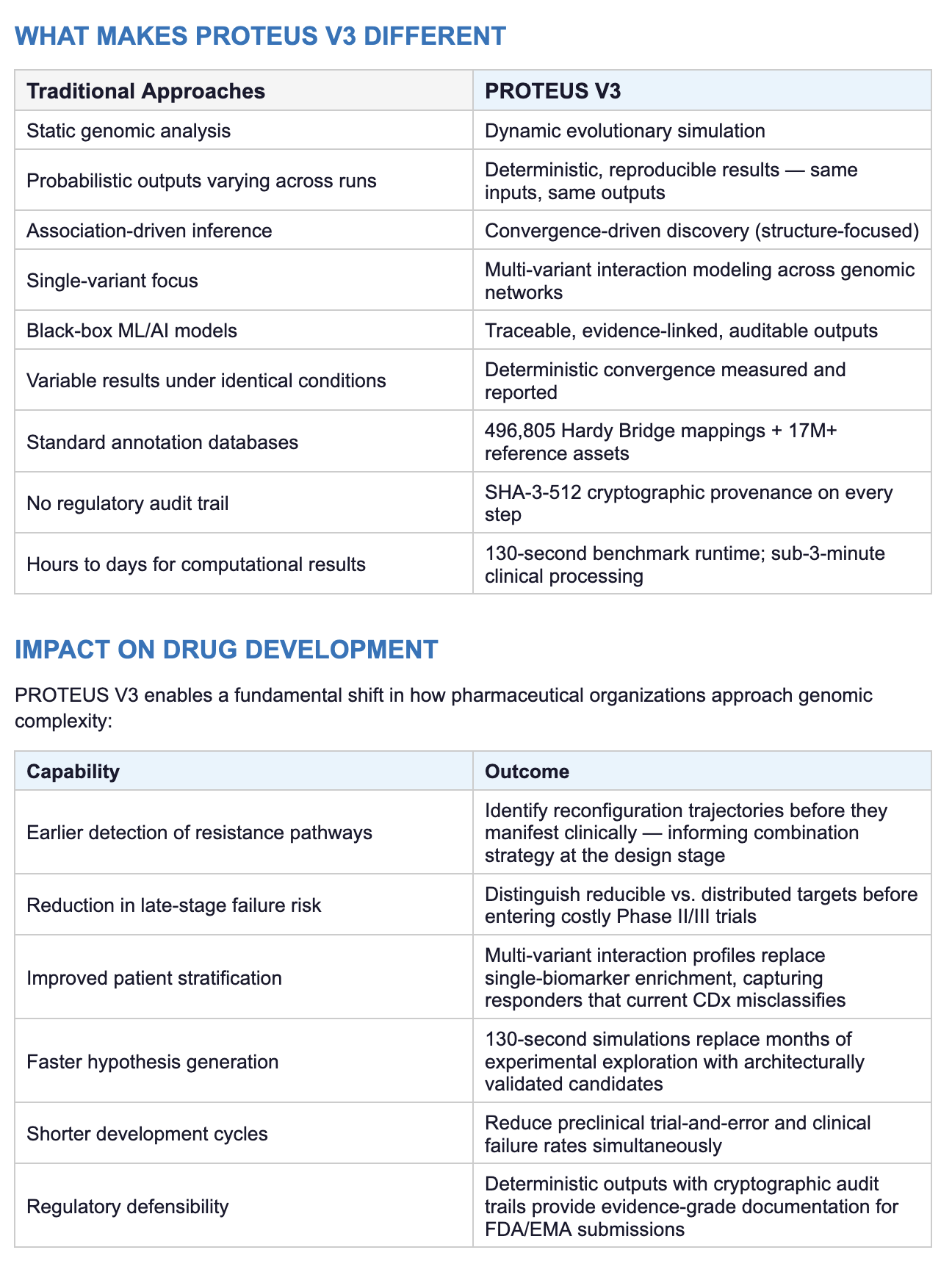 PROTEUS V3 addresses these failures directly. By measuring deterministic convergence, it classifies genomic systems as constrained or distributed — shifting drug discovery from association-driven inference to reproducible, structure-aware biological discovery.