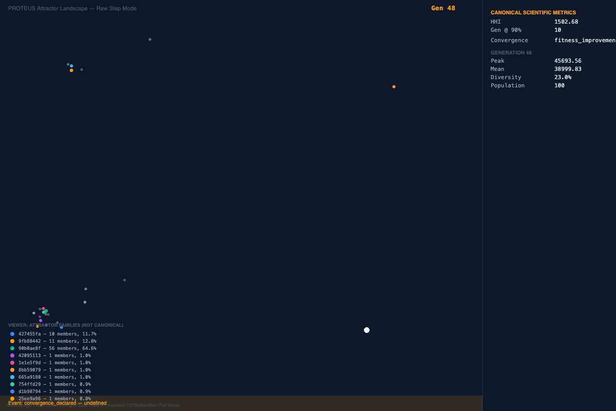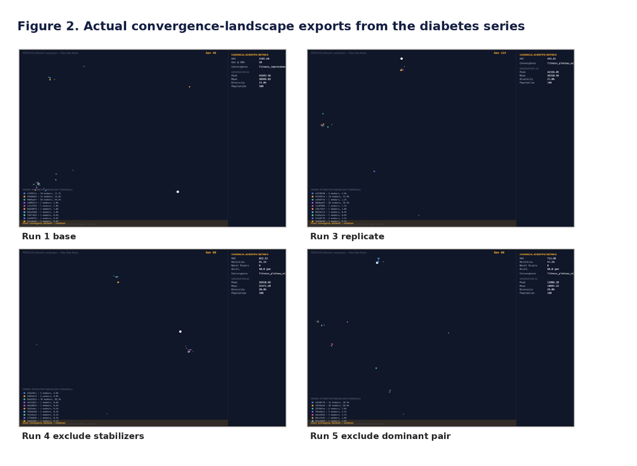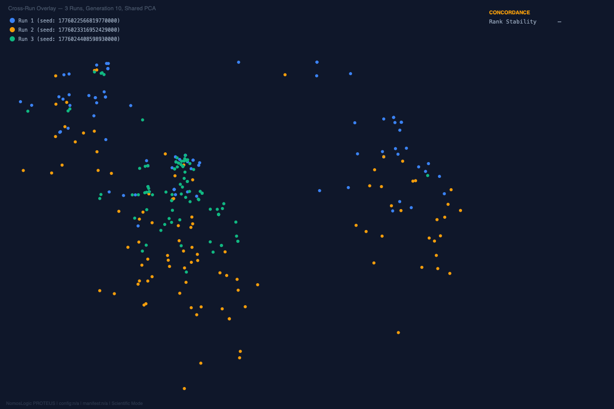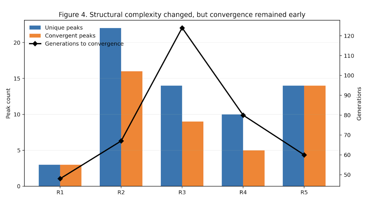And the visual story was aligned with the structural one. Across the repeated runs, the convergence landscapes remained organized rather than diffuse. The exact peak composition shifted at the margins, but the architecture kept returning to the same core family. That is not what random optimization drift looks like. It is what constrained recurrence looks like.