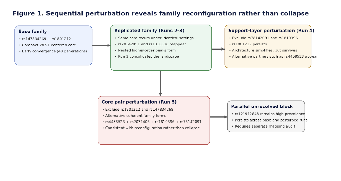 The baseline run and its same-parameter replications repeatedly returned a compact WFS1-linked family centered on rs147834269 and rs1801212, with rs1810396 and rs78142091 reappearing as recurrent support-layer variants. The importance of that result is not that these loci automatically constitute a final causal answer. The importance is that the system did not wander arbitrarily. Under identical conditions, it repeatedly found the same structural neighborhood.